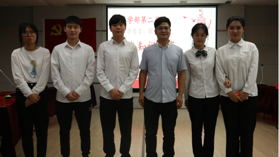 本次活动分为必答题、竞答题、加分题三个环节。必答题共有十五题,各支部参赛成员和场下观众分别答题,其中后四题以击鼓传花的形式进行,现场气氛活跃,互动频繁,在该环节中学生第三党支部和学生第四党支部处于领先地位;竞答题共十题,以抢答的形式进行,各支部参赛成员按下手中的抢答器,积极作答,现场气氛瞬间高涨,掌声雷动,学生第四党支部仍发挥稳定;加分题共七题,包括视频题与选择题,该环节是冲刺的转折点,各支部参赛成员互相追赶,不甘落后,现场氛围高度紧张。最后,学生第一党支部获得380分,位列第一。