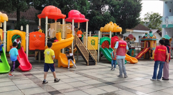 团队成员带领小朋友们上体育课,时刻关注学生安全