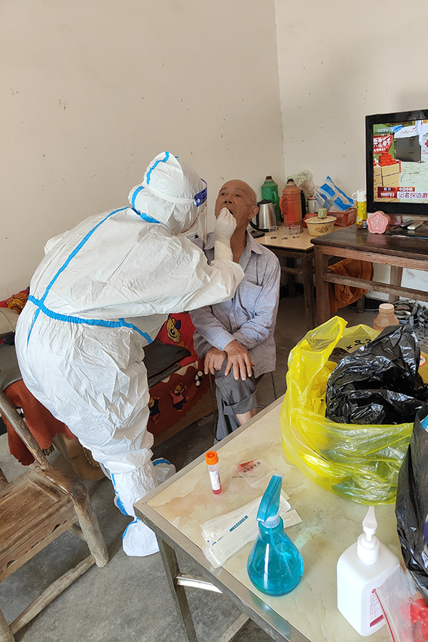 这支队伍负责的区域是市政府大院,这里是老旧小区,共有20栋步梯房,志愿者们冒着高温,穿着防护服,每一栋都要从1楼爬到7楼,来回往返。三人组里有位女生是第一次参与入户核酸采样,由于防护服穿着全封闭,她大量出汗,因进水不便差点脱水。途中社区网格员一直加油打气,建议若她坚持不住的话就可以休息一下。但她坚定地回答:“我一定会完成任务,与同伴一起完成采样任务,与同伴共奋进。”回到休息区脱下防护服的那一刻,志愿者们鞋子、手套、口罩里全是汗水,下沉的党员干部以及工作人员看到此状连忙去到居民家中冲来白糖水为志愿者们补充能量。