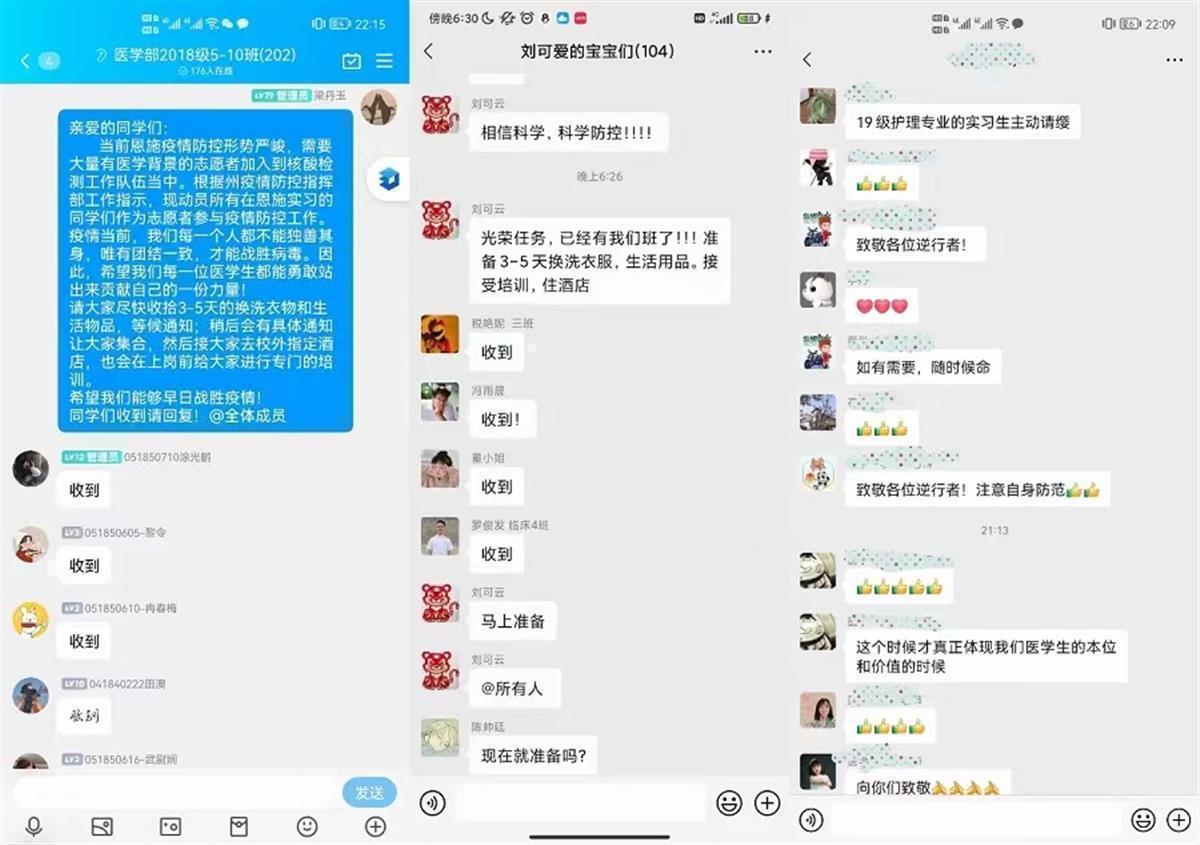 9月9日下午6时,该校医学部面向师生发布信息征集志愿者,“当前恩施需要大量有医学背景的志愿者加入到核酸检测队伍当中。希望我们每一位医学生都能够勇敢站出来,贡献自己的一份力量!”不到半小时的时间,450个志愿者指标就满额。