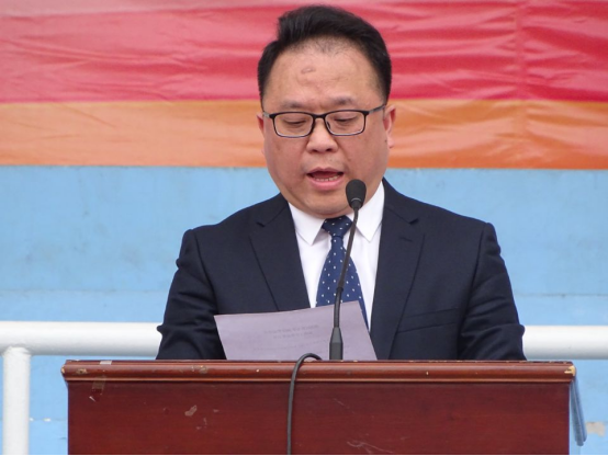 何斌宣布运动会团体总分排名及荣获“体育道德风尚奖”的学院