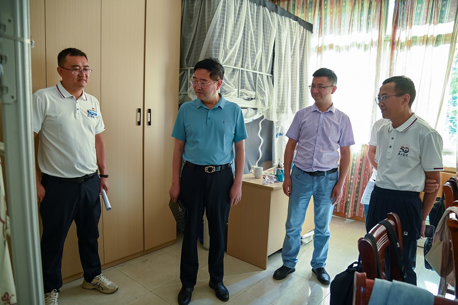 邓磊(左二)查看学生寝室情况