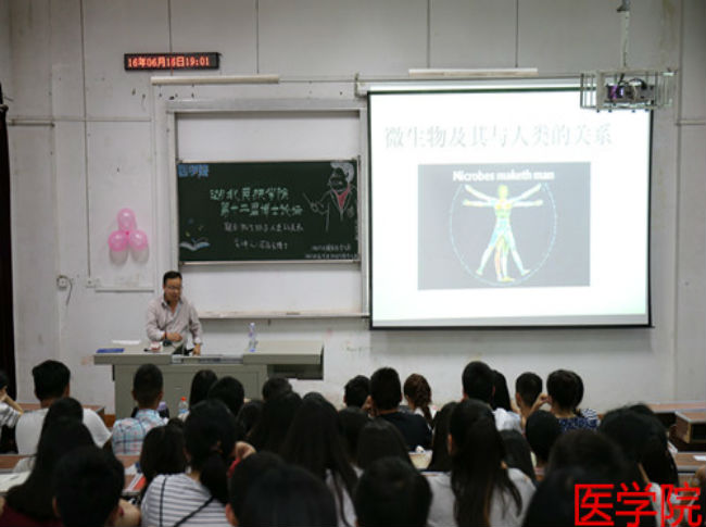 本网讯(记者 左云杰 徐祎)6月16日晚,由湖北民族学院学生会主办,湖北民族学院医学院学生会承办的第十二届题为“微生物与人类的关系”博士论坛于我院8207教室顺利举办,主讲人为我院微生物学老师石廷玉博士,各二级学院近两百人参加此次讲座。