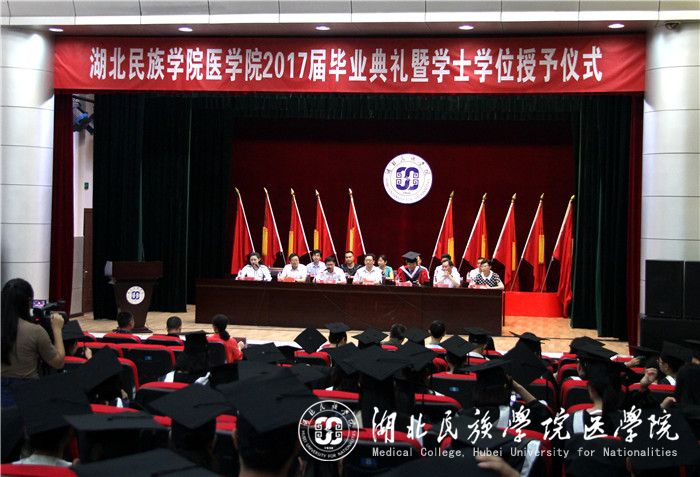 大会在庄严的国歌中拉开序幕。大会伊始,由我院党委书记刘红老师宣读《湖北民族学院医学院优秀毕业生》表彰文件,我院副院长罗洪斌老师宣读《湖北民族学院2017届毕业生学位授予名单》。紧接着,由我院院长向阳为毕业生代表授予学位。毕业生代表们身着学士服,头顶学士帽,走向舞台,收获自己种了四年或五年的硕果。优秀毕业生代表冯一洲同学将大学5年的自身感悟与大家分享共勉。他表示,医学之路漫长而艰辛,我们应不忘初心,不让日渐恶化的医患关系影响我们的决心。此外,我们还应心怀感恩,感恩宿管阿姨,感恩老师,感恩医学院,感恩湖北民族学院。随后,教师代表陈龙菊老师发言,她围绕不忘民院精神、珍惜友情、努力栽培自己三方面展开演讲。陈老师指出,机会总是留给有准备的人,只有努力栽培自己的人才有可能得到眷顾。最后,由我校党委书记吴建清书记致辞。吴书记对毕业生提出了三个期望,他希望同学们在今后生活中“铭记医学生誓言,不负初心”、“行以致学,学以致用”和“情系家国,常怀感恩之心”。他说到,面对纵横交错的社会利益,错综复杂的社会矛盾,我们要多一些冷静,少一些盲从,多一些独立思考,少一些偏信。社会浮躁,但是教育不能浮躁,医学更不能浮躁。