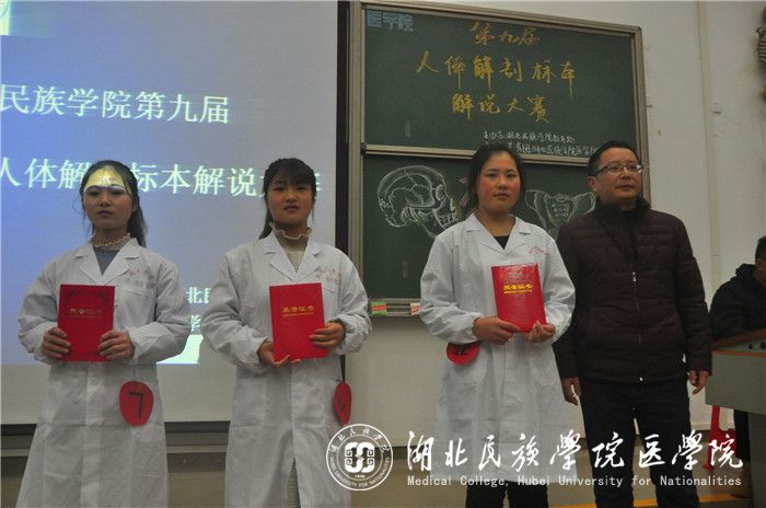 本网讯(通讯员 李明辉 苗佩佩 卢天琳/文 杨漫丽/摄)为弘扬医学风采,进一步展现我院特色,12月11日,由我校教务处主办、我院团委承办的第九届人体解剖标本解说大赛决赛于修远楼5B509教室举行。我院解剖教研室老师李国贵、陈龙菊、谭文波、吴刚、谭刚担任评委,我院党委副书记张蕊、学生科科长向驰及团委书记张鼎应邀出席。