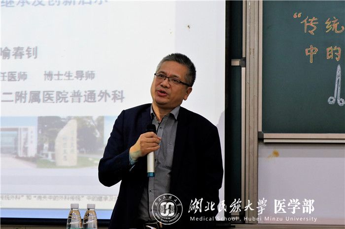 喻春钊主要从“医生的学识与技能来源”、“传统医学:从外科开始”、“外科学的传统与英雄”、“解剖学是现代外科学的基础”、“外科传统的另一面”等方面对外科学进行详细阐述。其中,他指出解剖学是现代外科学的基础,并且指出病理学的掌握情况是评判外科水平的标准。当他讲到传统医学时说:“传统医学从外科学开始,只有理念创新,才能带动整个医学。”讲座最后,他表示我们现有的知识和经验以及惯性思维往往是我们创新的最大敌人,也是我们否认别人的理由。