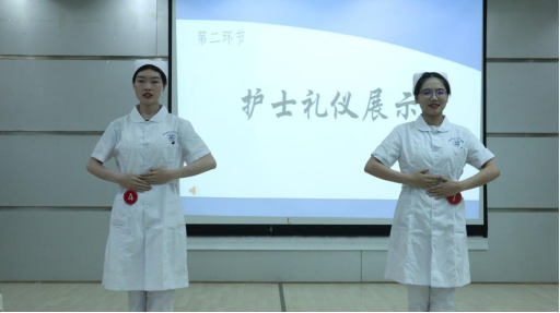 比赛在学生会办公室同学朗诵的《星夜驰援》中拉开帷幕。经过前期评选,共有十四名选手进入决赛。本次决赛共有两个赛道,分别为护士礼仪展示和护理操作展示,护士礼仪展示又分基本礼仪展示和情景模拟两个环节。第一赛道共有六名选手参赛,在礼仪展示环节,参赛选手有序上场,展示仪容仪表、站姿、蹲姿、拾物姿、持病历夹、坐姿等基本护理礼仪,选手们动作展示整齐划一,动作设计别出心裁,操作行云流水,充分展现出护士应具备的职业素养;在情景剧表演环节,选手们结合临床实践自编自导自演,惟妙惟肖的表演引得观众的喝彩,通过情景再现的方式转变角色,展现患者需求,诠释敬佑生命、医护人员甘于奉献的职业精神。其中,4号选手韦宇芹同学模拟了患者强制要求更换靠窗病床的情景。面对患者的强制要求,她从容不迫,冷静应对,向患者解释原因并安抚患者,从而化解矛盾。