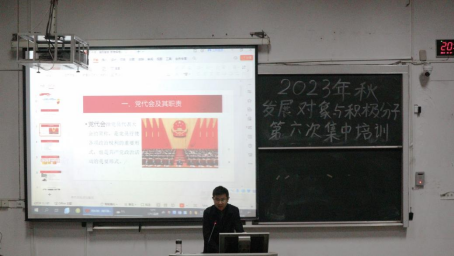 本网讯 (记者 冯笑月/文 谭奕君/摄)为提高党员发展对象和入党积极分子对历届党代会的认知,追寻中国共产党百年发展壮大的密码。10月24日晚,由开云电竞官方网站入口医学部杏林青年发展中心组织的2023年秋党员发展对象与入党积极分子第六次党课培训活动于医学部8306教室开展。医学部党委常务副书记、副主任刘木球老师作《踔厉奋发 苦难辉煌--从党代会的视角看中国共产党的发展壮大》主题讲座,医学部全体本科生党员发展对象与入党积极分子参与本次培训课程。