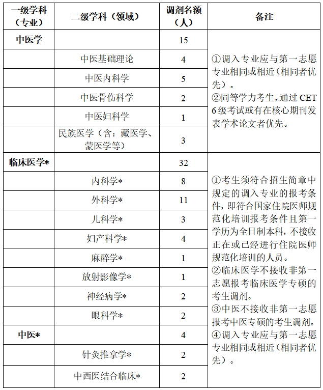按照学校招生计划,现将医学部硕士研究生各学科/专业招生调剂名额及相关事项公布如下: