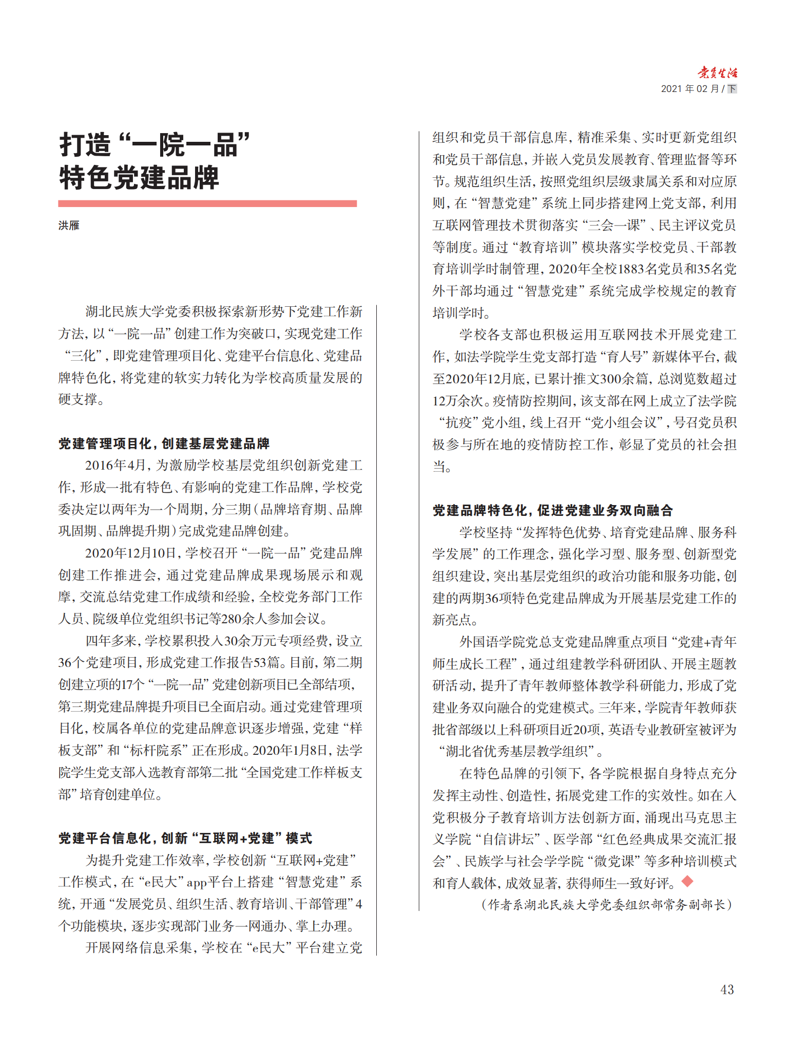 《党员生活》专题报道我校“一院一品”党建品牌建设情况
