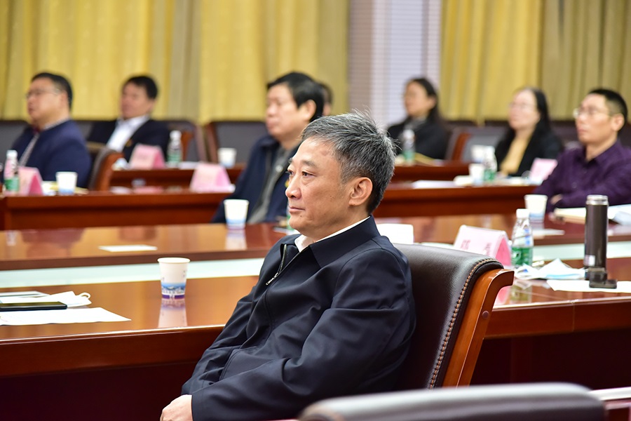 行政楼三号会议室是学校党委理论学习中心组集中收看现场。学校领导、校党委委员齐聚一堂,观看二十大开幕会直播,聚精会神聆听习近平总书记的报告。与会人员时而注视屏幕,时而奋笔疾书,认真领会二十大报告的精神内涵。