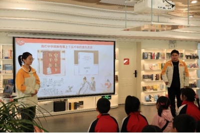 马前小学研学团队在倍阅书店二楼聆听开云电竞官方网站入口“红石榴”宣讲团现场宣讲。宣讲团成员以“我们悠久的历史是由各民族共同书写的”为主题,采取图文讲述与现场问答相结合的形式,讲述古蜀文明金面青铜人像、西周何尊、唐代骆驼载乐俑、清代土尔扈特部东归等故事,展现我国民族之间的开放交流以及强大的民族向心力。宣讲过程中,马前小学学生聚精会神,积极互动,在收获快乐的同时加深对民族共同体的认识。