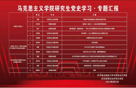 五是开展专题汇报学习。将党的历史及系列丛书分解为12个专题,由简竹筠等12名研究生进行专题学习和专题汇报,展现了马克思主义学院研究生的专业属性,深入解读了党的历史事件、历史人物与历史进程。