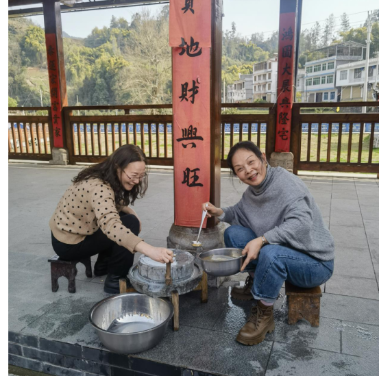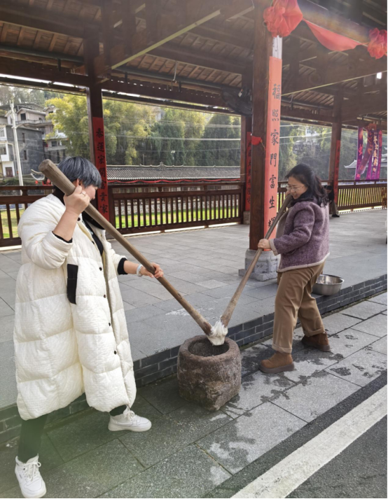 健步走比赛结束后,全体女老师又共同体验了农村推合渣、打糍粑。尤其是打糍粑,是一项劳动强度较大的体力活,一般都是由男子将蒸熟的糯米,倒入特制的石槽,再由身强力壮的男子,抡着特制的木锤不断旋转,柔打。女老师们在体验过程中一人一杵,配合默契,使出十足的劲儿让木杵砸向糍粑团,这样糯米才能被捶打得均匀,出来的糍粑才能磁实,有韧性,吃起来也分外香甜!